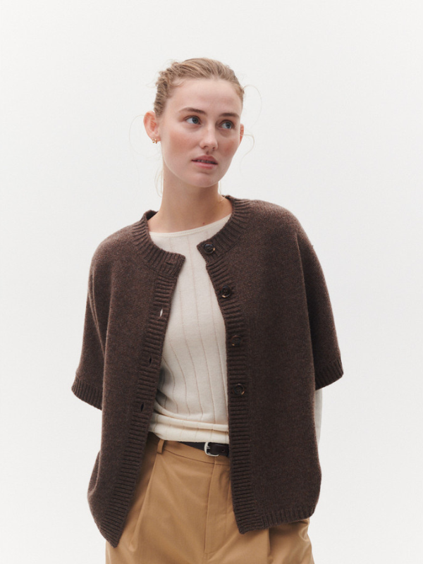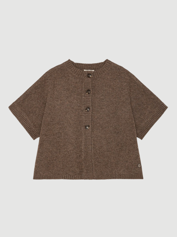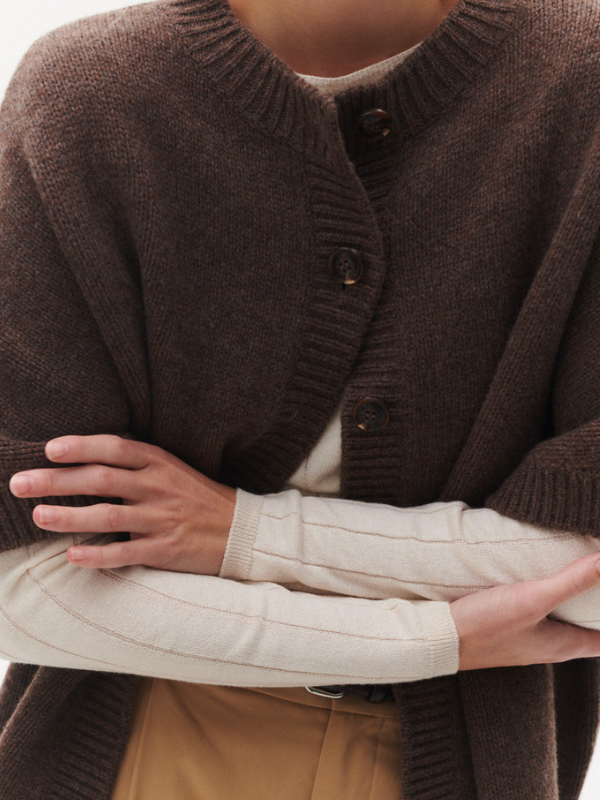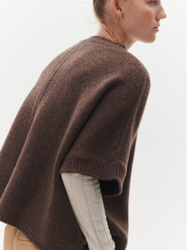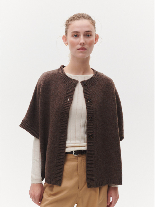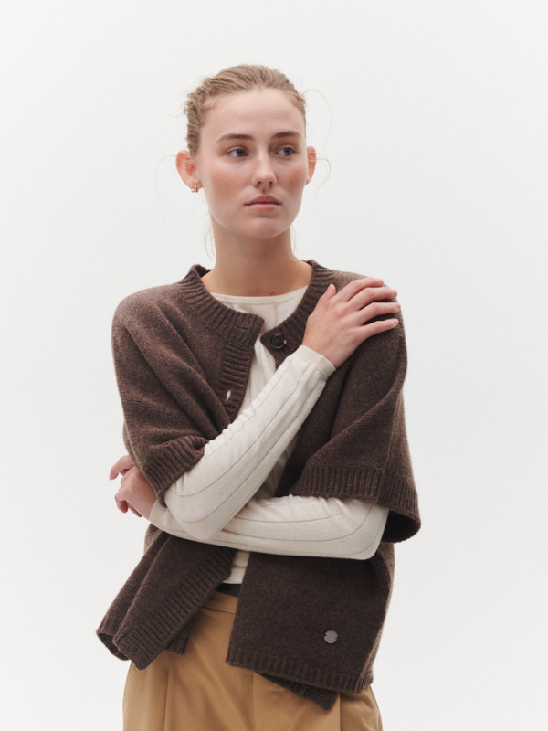 Malle vest fra BETA Studios i brun er et must-have for den stilbevidste, der ønsker både varme og elegance. Fremstillet i 100% Super Fine Merino uld, giver denne cape en utrolig blødhed og komfort, samtidig med at den holder dig dejlig varm. De korte ærmer og den smukke kabeldetalje på ryggen tilføjer et klassisk og sofistikeret præg.